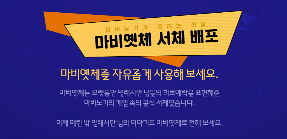 - 마비옛체 서체의 출처 표기를 권장합니다. 예) 이 페이지에는 마비노기가 제공한 마비옛체 서체가 적용되어 있습니다.