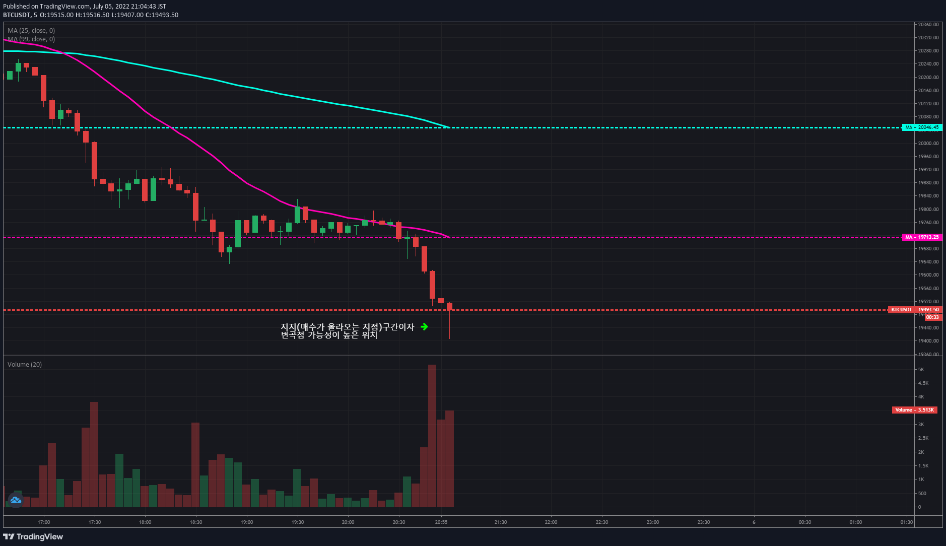매수세가 강했다면 저점이 내려가지 않았을 것이다. 꼬리를 달긴 했지만, 저점 역시도 낮아졌기 때문에 매도세 역시 매우 강하다는 것으로 이해할 수 있다. 즉, 적어도 위의 캔들과 거래량을 보고 판단한다면 조만간 바닥/변곡점이 될 가능성이 높다 정도로 판단할 수 있다는 것이다.