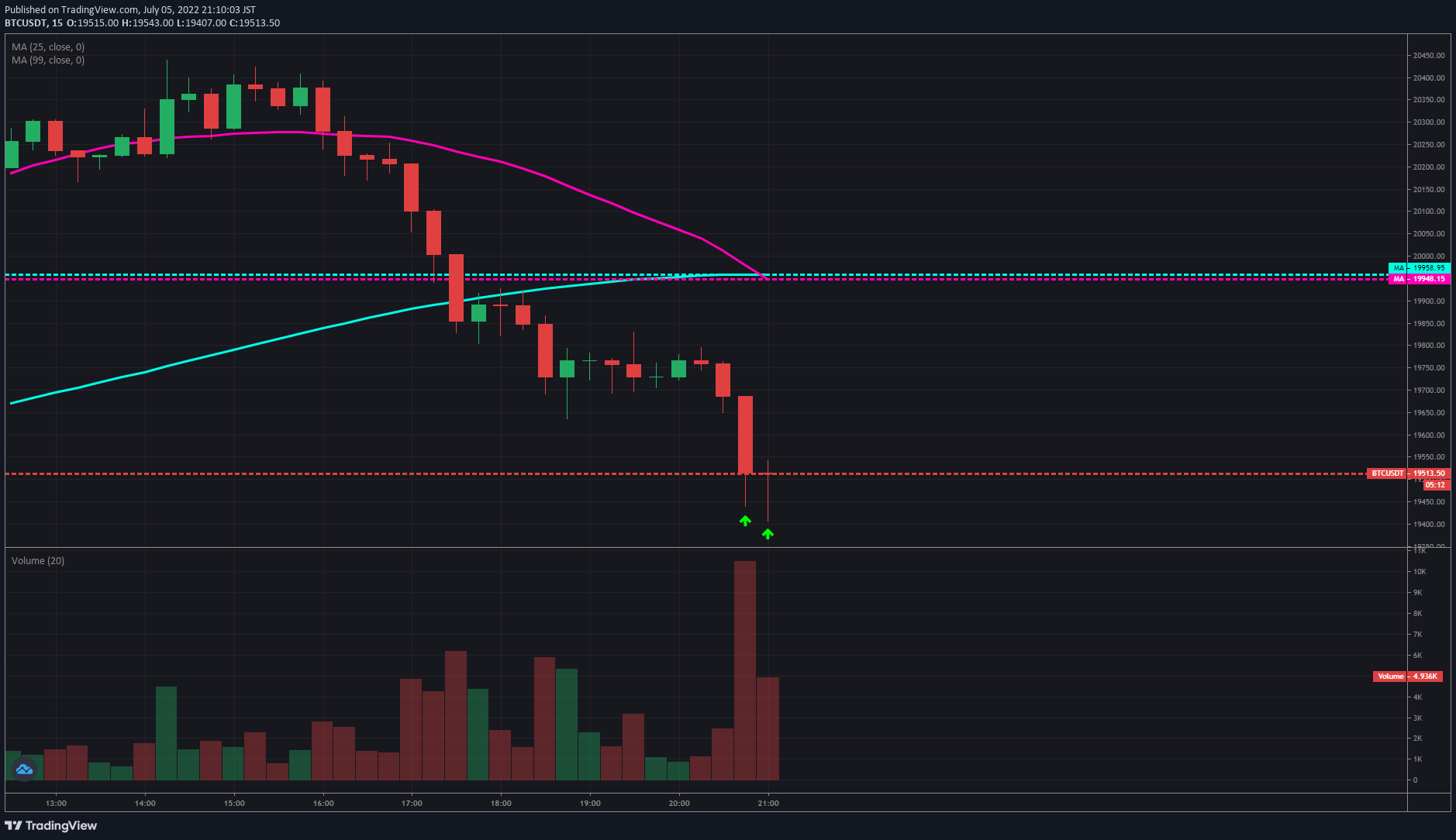 그래서, 이런 구간에서 포지션을 진입하는 가장 바람직한 방법은 분할매수로 일부 진입을 하고, 가격이 추가적으로 하락할 때의 거래량과 캔들의 길이를 보고 추가 매수를 하는 것이다. 이러한 원리는 가격이 상승하거나 하락했을 때 동일하게 적용된다. 하지만, 내 경우에는 꼬리를 달긴 했어도 여전히 저점이 내려가고 있기 때문에 롱포지션으로 진입하진 않을 것 같다.