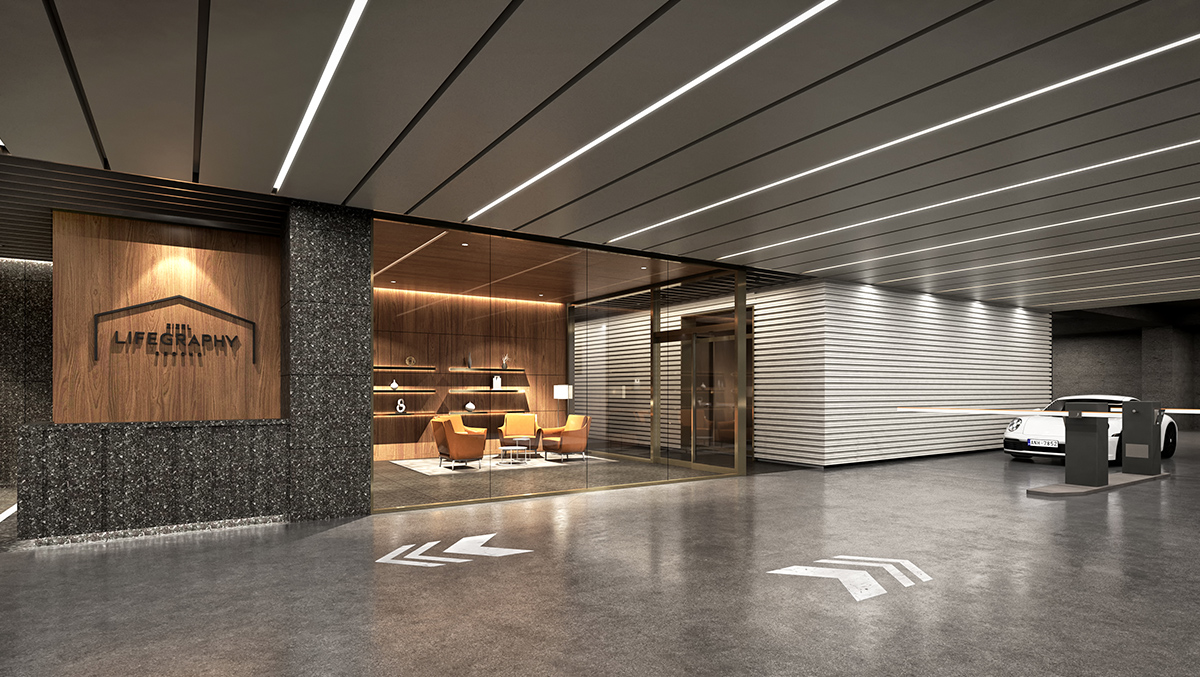 흔히 떠올리는 삭막한 풍경의 주차장과 달리 라이프그라피의 드롭 오프 존은 주차를 하거나 차를 찾는 짧은 시간도 편안하게 대기할 수 있도록 만든 공간입니다. 입주자를 가볍게 환대하는 또 다른 로비의 기능을 합니다.