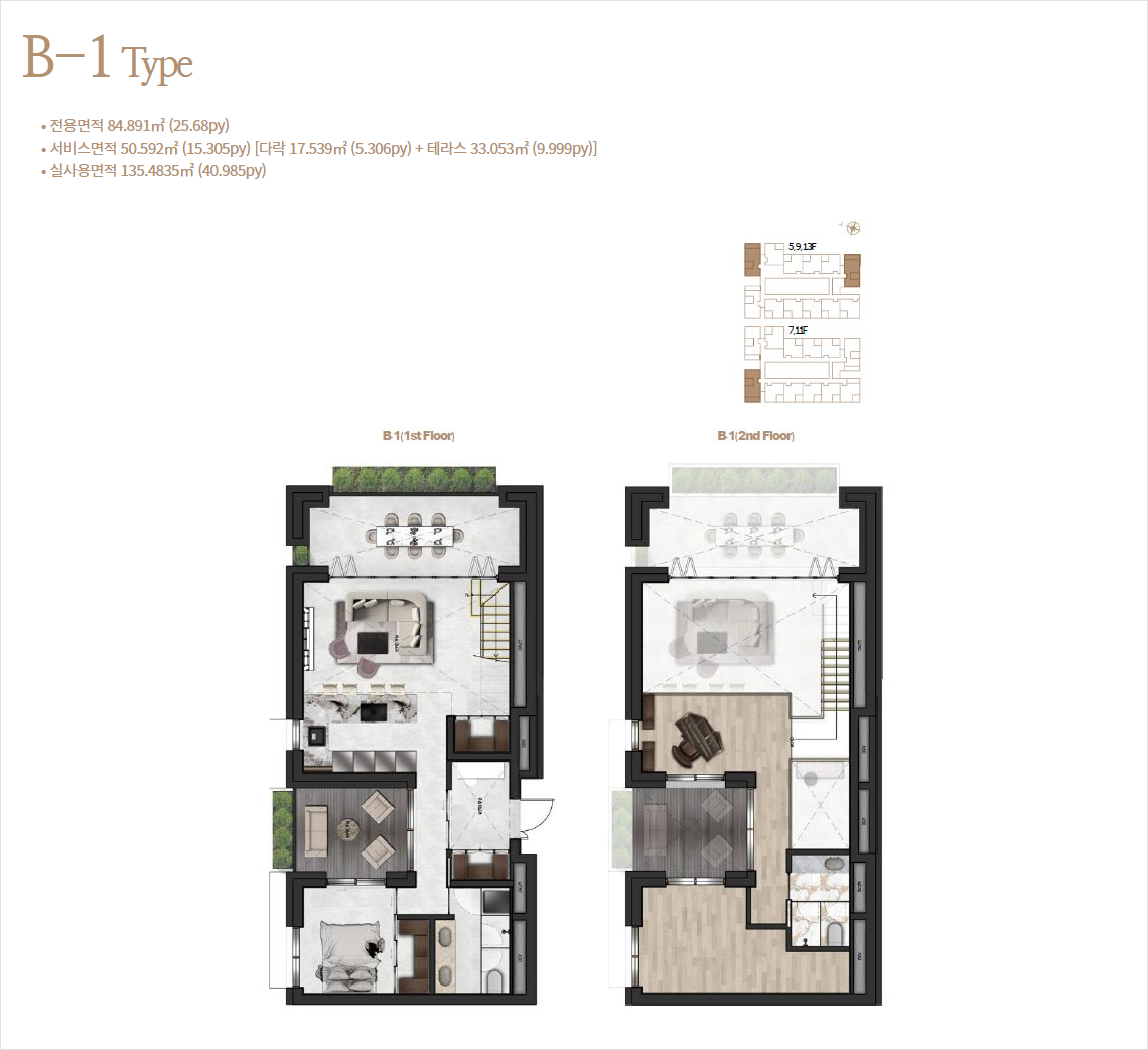 • 각 펜트 세 대중 1층의 최대 3개의 테라스(약 8평~13평)와 2층의 다락(약 12평~19평) 서비스면적(전용면적 대비 약 50~60%)으로 제공