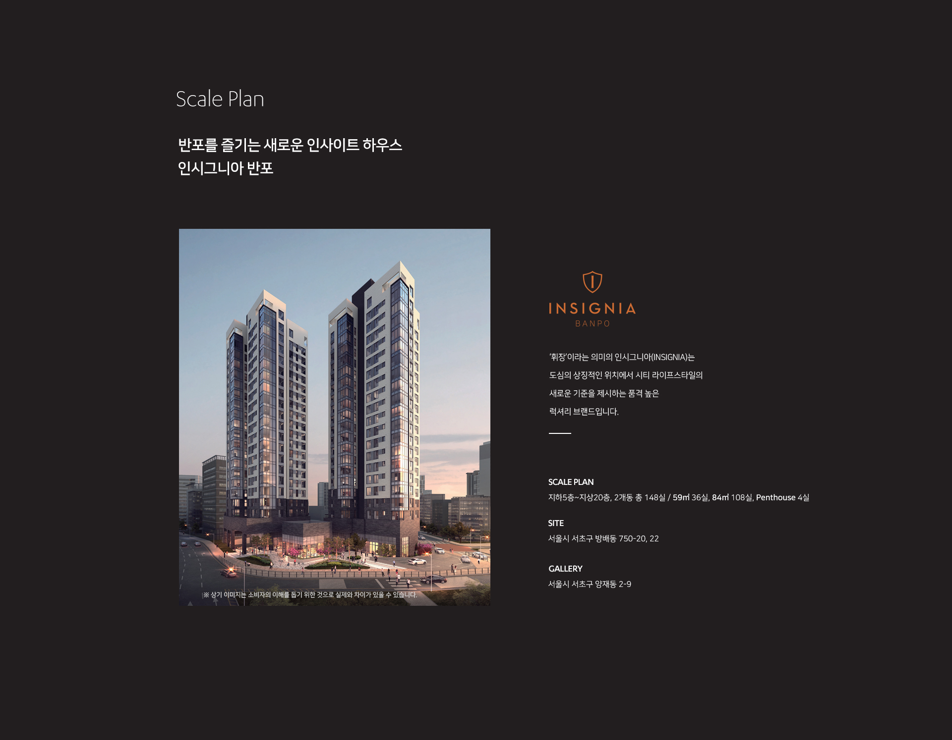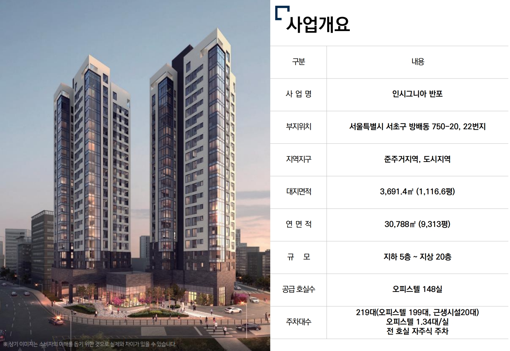'인시그니아 반포'는 지하 5층 - 지상 20층 2개 동 규모로, 오피스텔 전용 59 - 144㎡ 총 148실 및 근린생활시설 등으로 구성된다. 전용면적별로는 ▲59㎡ 36실 ▲84㎡ 108실 ▲펜트하우스 타입(119㎡ 2실·144㎡ 2실) 4실로 공급된다.