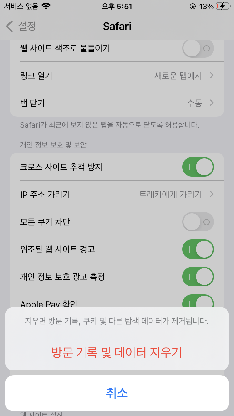 아이폰의 기본 설정에서 사파리 앱을 찾으면 하단에 방문 기록 및 데이터 지우기 기능을 활용할 수 있습니다.