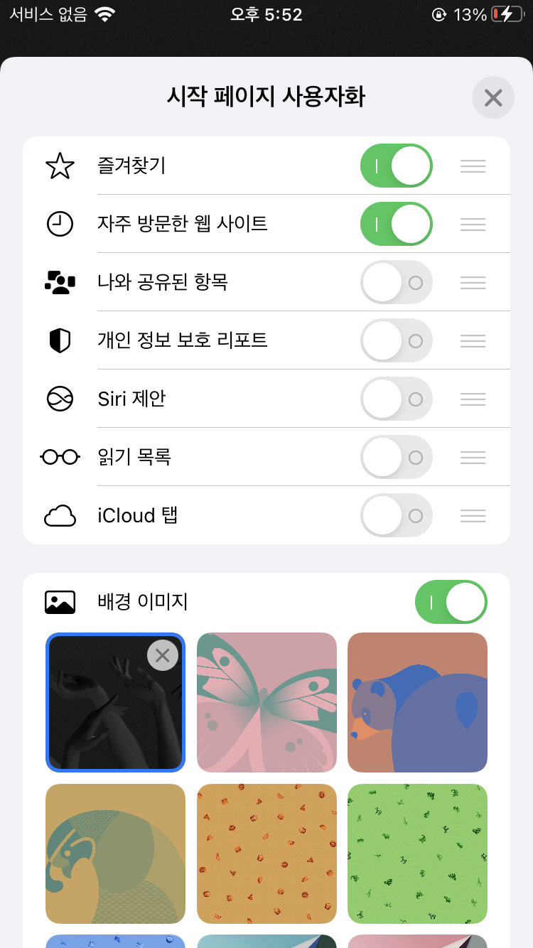 편집 버튼을 누르면 자주 방문한 웹 사이트를 비활성화 하시면 되겠습니다. 그럼 깔끔해집니다. 그 외에 안쓰는 기능들도 모두 해제해줍니다. 배경이미지 또한 원하는 이미지로 변경이 가능합니다. 홈페이지에 사용 된 이미지를 그대로 가져와서 적용했습니다.