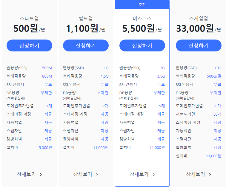 블루호스트와 완전히 대비되는 구성요소라고 할 수 있는데, 일단 가격의 경우 블루호스트보다 비쌀 수밖에 없다. 웹용량과 트래픽용량이 상당히 제한적이기 때문에 꾸준히 운영하고자 한다면 결국에는 스케일업 서비스로 업그레이드 할 수 밖에 없다고 판단된다.