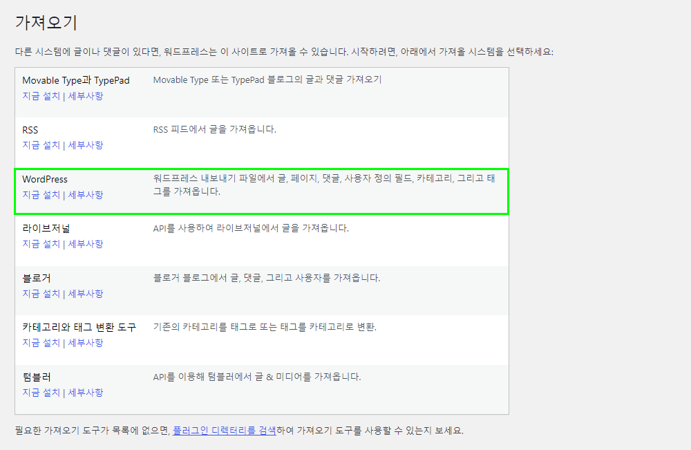 위의 체크한 표시에서 지금 설치를 통해서 해당 기능을 이용할 수 있다. 이 기능을 활용하여 워드프레스 파일을 쉽게 옮길 수 있다. 하지만 이 기능을 활용해서 백업하는 사람들은 많지 않다. 여러 가지 원인들이 있겠지만 글을 가져온다고 하더라도 이미지 파일은 가져오지 않거나 이미지는 가져왔지만 글과 연동되지 않는 등 다양한 문제점이 발생할 수 있다는 것이다.
