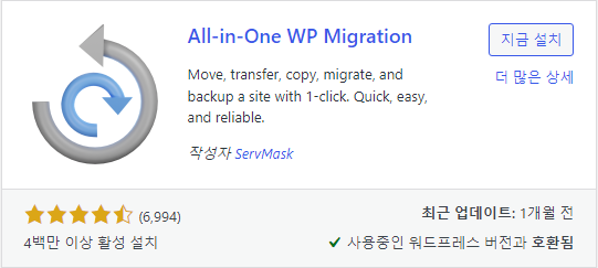 동시에 백업 기능으로도 활용할 수 있기 때문에 많은 사람들이 사용하는 플러그인이며, 워드프레스 최신 버전과 잘 호환된다. 그러나, 내 경우에는 정상적으로 작동하지 않았기 때문에 워드프레스 테마나 DB 등에 따라서 데이터 이전이 어려울 수 있다는 점도 참고하기를 바란다.