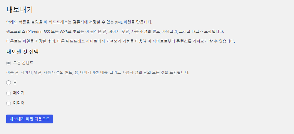 워드프레스 기능 중에서는 다른 워드프레스로 데이터를 쉽게 옮길 수 있는 기능이 있다. 워드프레스 플러그인 중에서도 백업 플러그인들이 많이 있지만, 자체적으로도 데이터 백업 및 이전 기능이 있다는 것이다. 위 항목에서 내보내기 파일 다운로드를 하면 확장자 (.xml)로 파일을 다운로드할 수 있다.