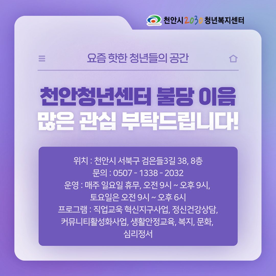 천안청년센터 이음에 대해서 알아보고자 합니다. 오랫동안 천안에 거주했던 경험이 있기 때문에 천안에 대해서 더 잘 알아가 보고자 합니다. 천안청년센터 이음은 2019년 1월 9일에 개소했다고 하네요. 기본적으로 '청년' 타이틀을 달고 있기 때문에 청년과 관련된 일들을 하고 있는 걸로 예상됩니다.
