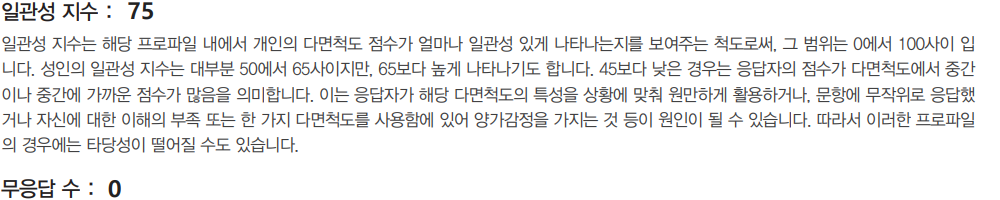 내가 기존에 알고 있었던 나의 유형이 아닌 전혀 다른 유형이 나왔음에도 불구하고 일관성 지수는 상당히 높게 나왔다. 대부분 50점에서 65점 사이지만, 65보다 높게 나타난 75점이라면 상당히 높게 나왔으므로 해당 정식 검사의 신뢰성과 정확성은 상당히 높다고 판단할 수 밖에 없다.