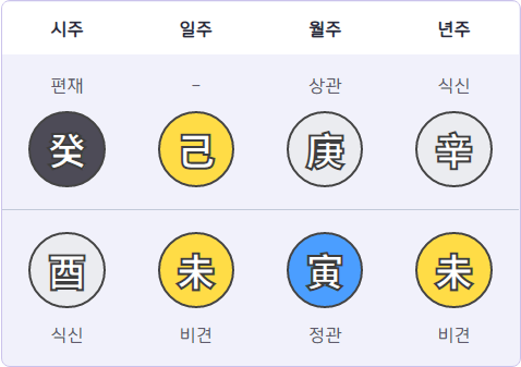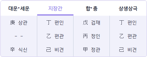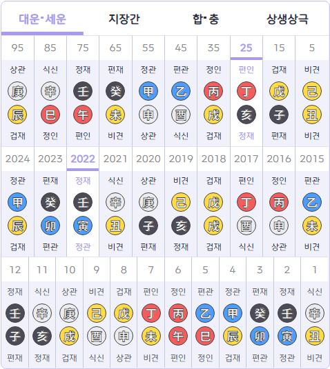 월지 인목 속 지장간에는 병화가 숨어있다. 갑목을 바라보면 정관이 떠오르고, 병화를 바라보면 정인이 떠오른다. 병화대운이자 갑목이 올 때 가장 아름다운 순간이 올 것이라 생각한다. 좋은 시간이 다가온다고 해서 평탄할 거라 생각하진 않는다. 오히려 더 많은 고된 일들이 기다리고 있을 것이다.