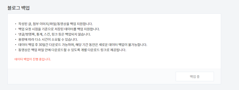 - 댓글/방명록, 통계, 스킨, 링크 등은 백업되지 않습니다.