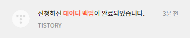 - 티스토리 데이터 백업이 완료될 경우 위와 같이 티스토리 알림을 통해서 안내받을 수 있습니다.