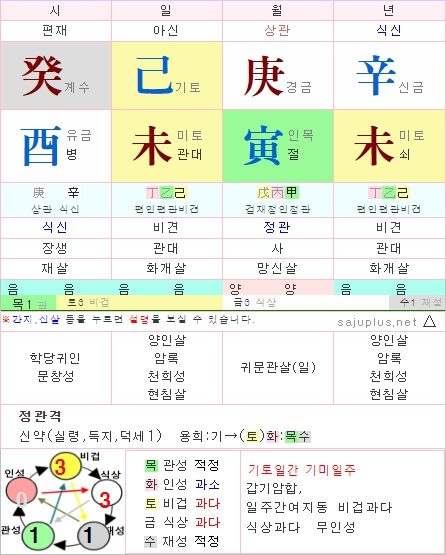 ※ 월지가 일간과 같은 오행(비겁)으로 되어 있거나 일간을 생조하는 오행인 인성으로 되어 있다면 신강인 경우가 많다.