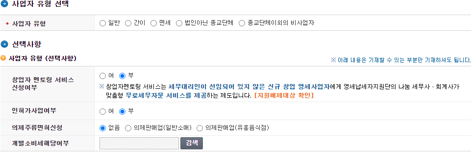 위와 같이 인적 사항 입력 부분에는 사용하고자 하는 상호명을 넣어주세요. 마음에 드는 어떠한 상호명도 상관없으나 저작권과 관련되거나 상호명 중복(동일한 상호명 여부) 확인 후에 상호명을 입력해주시면 되겠습니다. 주소지 동일 여부를 체크하면 현재 거주하고 있는 주소지를 사업장 소재지로 적용시킬 수 있습니다.