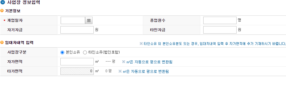 타인소유의 경우에도 간단한 사업자일 경우에는 본인소유에 체크 후 임대차계약서를 첨부해도 처리해줍니다. 타인소유일 경우에는 꼼꼼하게 입력해야 하는데, 임대차 계약서에 나와 있는 내용과 임대인의 정보를 입력해야 합니다.