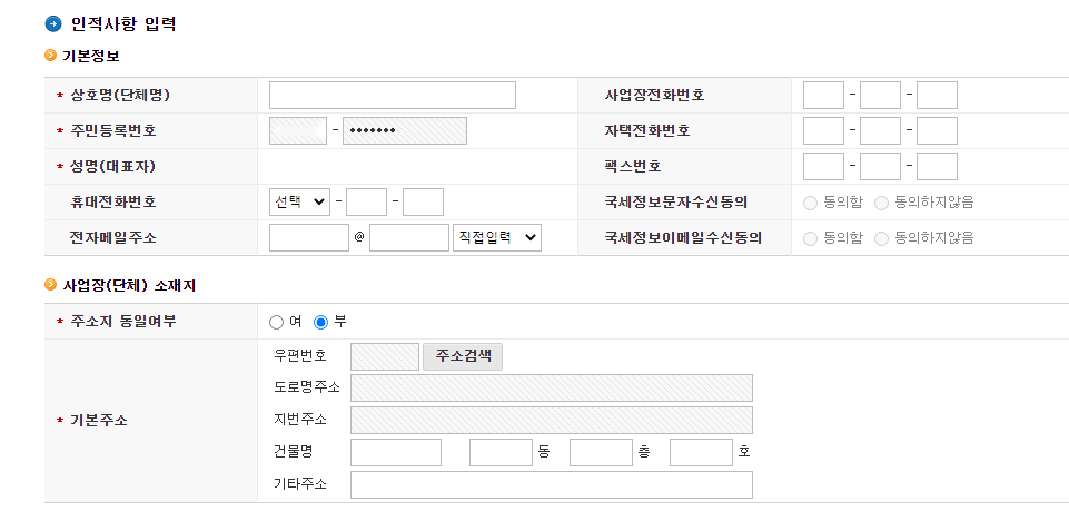 위와 같이 인적 사항 입력 부분에는 사용하고자 하는 상호명을 넣어주세요. 마음에 드는 어떠한 상호명도 상관없으나 저작권과 관련되거나 상호명 중복(동일한 상호명 여부) 확인 후에 상호명을 입력해주시면 되겠습니다. 주소지 동일 여부를 체크하면 현재 거주하고 있는 주소지를 사업장 소재지로 적용시킬 수 있습니다.