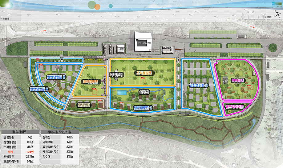불타는 장작을 멍하니 바라보면서 스트레스를 풀 수 있는 '불멍'을 즐길 수 있는 캠프 파이어존도 5곳이나 있습니다. 여름이면 아이들이 가족과 함께 즐길 수 있는 '실개천'과 소규모 공연이 가능한 '야외무대'가 활력을 더할 것으로 기대됩니다.