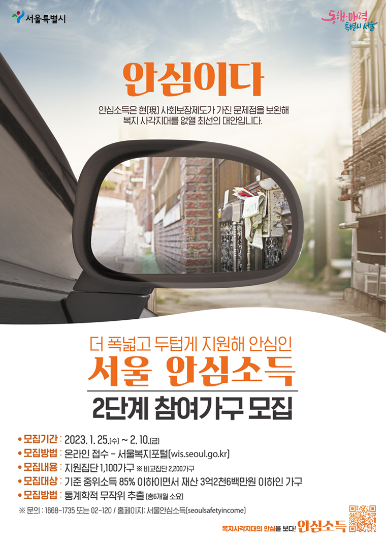 서울시가 '안심소득 2단계'에 참여할 1,100 가구를 모집합니다. 서울시가 저소득층을 지원하는 서울안심소득 2단계에 참여하는 가구를 모집합니다. 지난해 500 가구에 이어 올해도 모집인원을 1,100명으로 대폭 늘리고, 소득기준도 중위소득 85% 이하, 자산 3억 2,600만 원 이하 가구로 확대합니다. 시는 1월 25일부터 2월 10일까지 서울시 복지포털을 통해 신청을 받고, 최종 선정된 가구는 7월 11일부터 2년간 매월 안심소득 지원을 받게 됩니다. 신청 방법과 일정 등 자세한 내용을 알려드리겠습니다.