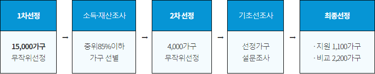 시는 참여 가구 규모와 세대주 연령 등을 고려해 통계를 토대로 3차례 무작위 표본추출 방식으로 지원군 1,100 가구를 선정합니다. 참여가구는 가구원수(1/2/3/4 이상)와 세대주 연령(39세 이하/40 - 64/65세 이상)을 기준으로 12개 구간으로 나눠 1만5000가구를 무작위로 선정해 최종적으로 1,100가구를 선정합니다.