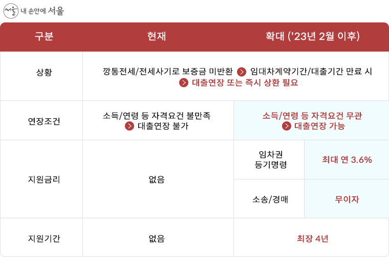 시는 깡통전세나 전세사기로 인한 피해가 신혼부부와 20~30대 청년에게 집중된 점을 고려해 전세기간이나 대출기간이 만료되더라도 소득이나 연령 등 자격요건에 관계없이 파격적인 지원을 하기로 했습니다.