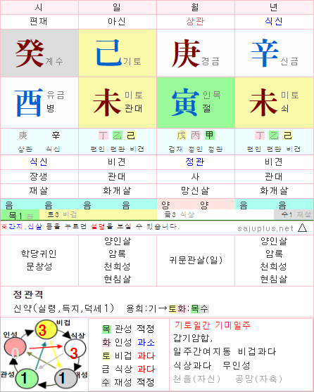기미일주 자체로도 쌔다고 볼 수 있습니다. 정관(갑목/인목)을 쓰게 되면 갑목과 인목은 미토에 입묘당합니다. 입묘를 당하면서 미토와 인미 귀문관살, 원진 작용을 하게 됩니다. 그래서 미토는 정관을 쓰기보다 편관이 더 잘 어울립니다. 그래서 기미일주는 정관에 대한 기대치를 낮추는 것이 좋겠습니다.