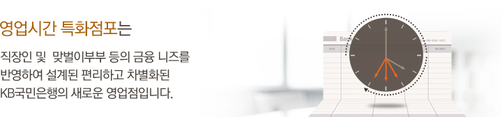 영업시간 특화점포는 직장인, 맞벌이 부부 등 영업시간 중 은행 방문이 어려운 고객을 위해 퇴근 후에도 이용할 수 있는 국민은행 지점을 말합니다. 따라서 영업시간이 끝나더라도 인근 국민은행 특화점포를 검색하면 은행 업무를 할 수 있습니다.