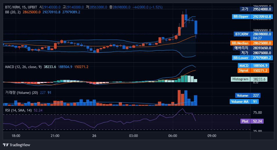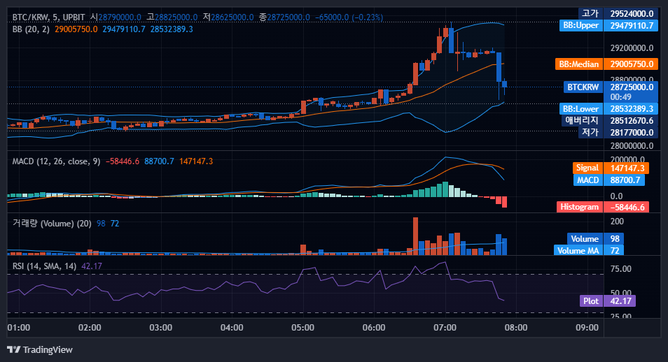 5분 봉 스캘핑이라면 위와 같은 구간에서 조금 달콤할 수 있습니다. 볼린저밴드 하단을 긁으면 매수하고 싶어지는 것이죠. 그렇지만 최근에 가격이 매우 빠르게 상승했기 때문에 여전히 위험요소는 있다고 봅니다. 매수가 조금 올라온 지점이기 때문에 스캘핑 트레이더라면 매수 버튼에 손이 갈 수 있습니다.