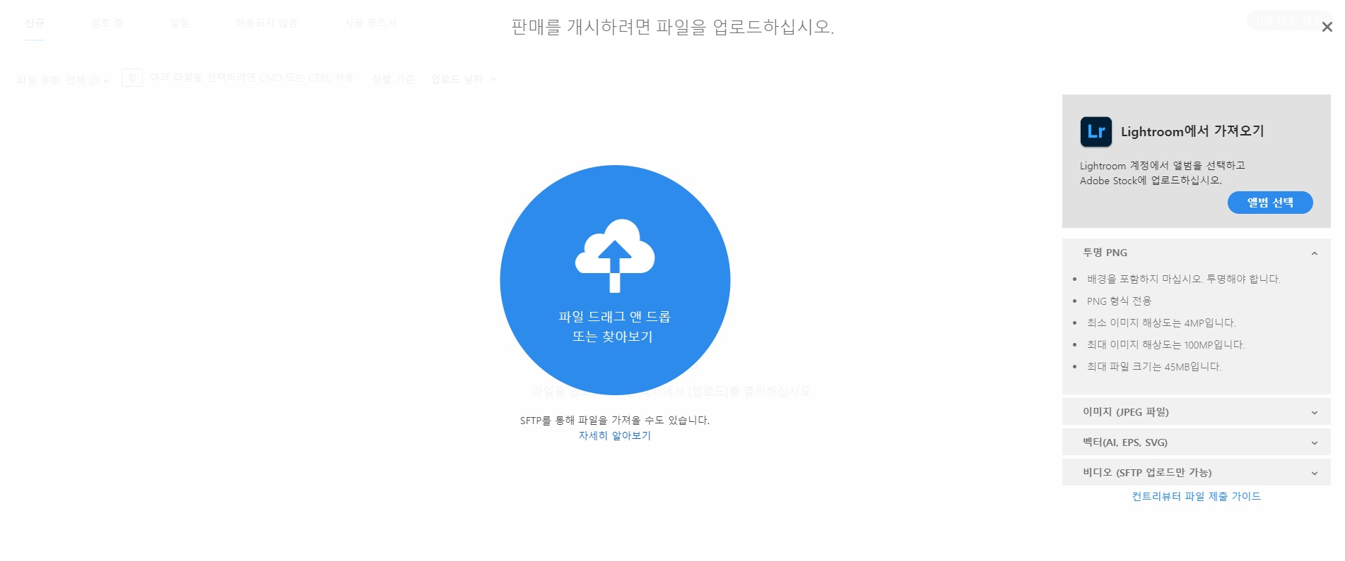 위와 같이 사진을 판매하려면 사진 파일을 드래그 앤 드롭으로 등록하거나 클릭해서 가져올 수 있습니다. 라이트룸에서도 가져올 수 있어 사진을 전문적으로 보정하는 사람이라면 한 번에 등록해서 더욱 전문적인 사진을 통해 많은 수익을 올리실 수 있을 거라고 생각합니다.