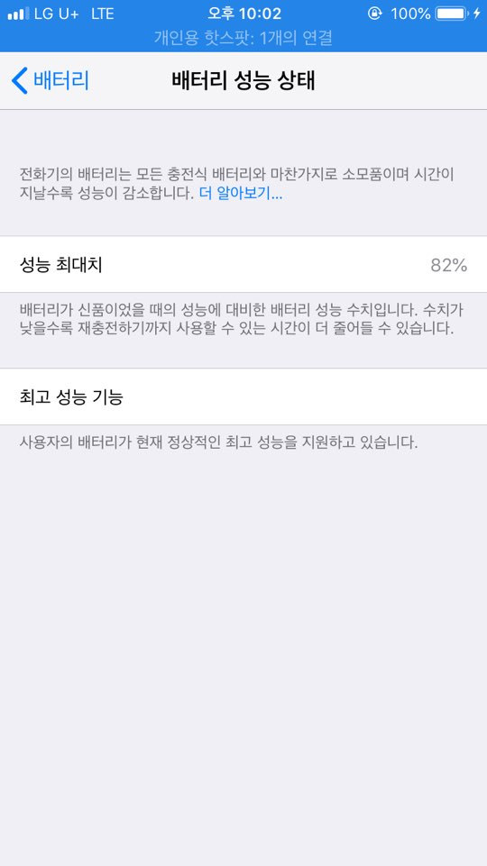 성능 최대치에 따라서 최고 성능 기능의 상태가 변경됩니다. 따라서 현재 배터리가 최고의 성능을 기록하고 있다면 별도로 배터리를 교체하지 않아도 되는데, 성능에 문제가 있다면 아이폰 서비스센터에서 배터리를 교체하시거나 중고폰으로 판매하고 새로운 휴대폰을 구매하는 것이 좋은 방법이 될 수 있겠습니다.
