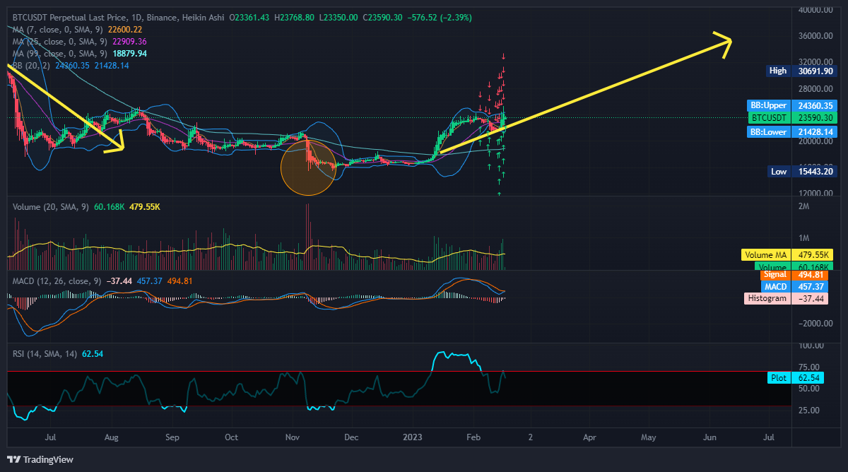 위와 같은 개념을 이해한다면 쉽게 응용할 수 있습니다. 보기 편하게 하이킨 캔들로 변경하였으나 각 트레이딩 환경에 맞게 판단하시길 바랍니다. 일단 이동평균선 위에 강하게 추세를 뚫고 올라갔으며 바로 이전에서는 강한 거래량이 발생했다는 것을 쉽게 알 수 있습니다. 즉, 이러한 차트의 모습은 앞으로도 가격이 크게 상승할 수 있다는 것을 예상해 볼 수 있습니다.