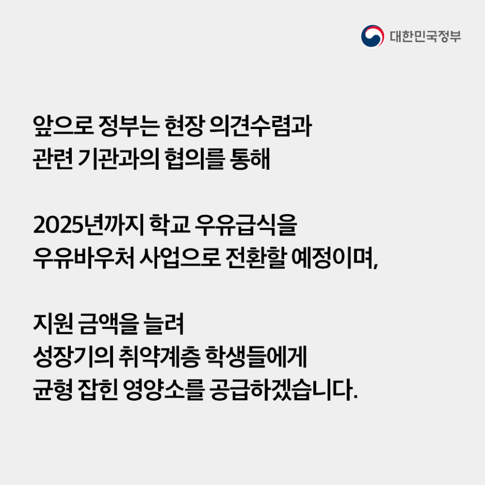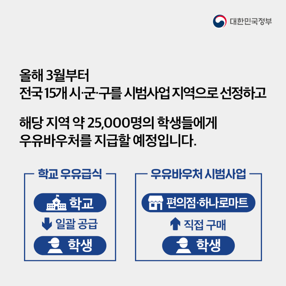 시범사업에서 확인된 우유바우처의 효과와 호응으로 인해, 보다 많은 취약계층 학생들에게 지원이 이뤄지고, 학생들의 영양 개선과 건강한 성장에 큰 기여하길 기대해봅니다.