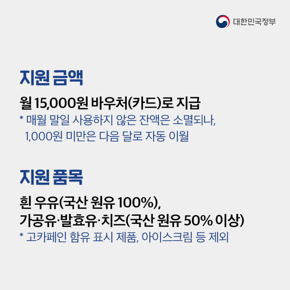 지원 대상 학생은 만 6~18세 국민기초생활수급자, 차상위 계층, 한부모가족, 장애인, 국가유공자 자녀로, 해당 학생들은 매월 15,000원 상당의 우유바우처를 받을 수 있습니다.