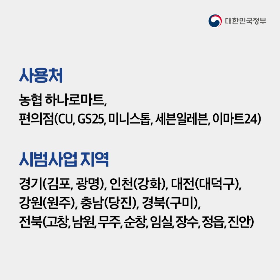 우유바우처는 흰 우유(국산 원유 100%)와 가공유, 발효유, 치즈(국산 원유 50% 이상)를 구매할 수 있는데, 사용 가능한 매장은 농협 하나로마트와 편의점(CU, GS25, 미니스톱, 세븐일레븐, 이마트24)입니다.