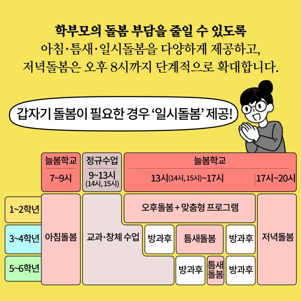 지역별 및 학교별 여건에 따라 필요할 때 아침 돌봄, 저녁 돌봄 등 다양한 유형의 돌봄 서비스를 제공하며, 긴급하게 저녁 돌봄이 필요한 학생들을 대상으로 17시 이후 하루 또는 일정 기간 돌봄을 제공하는 '일시 돌봄' 서비스도 운영된다.