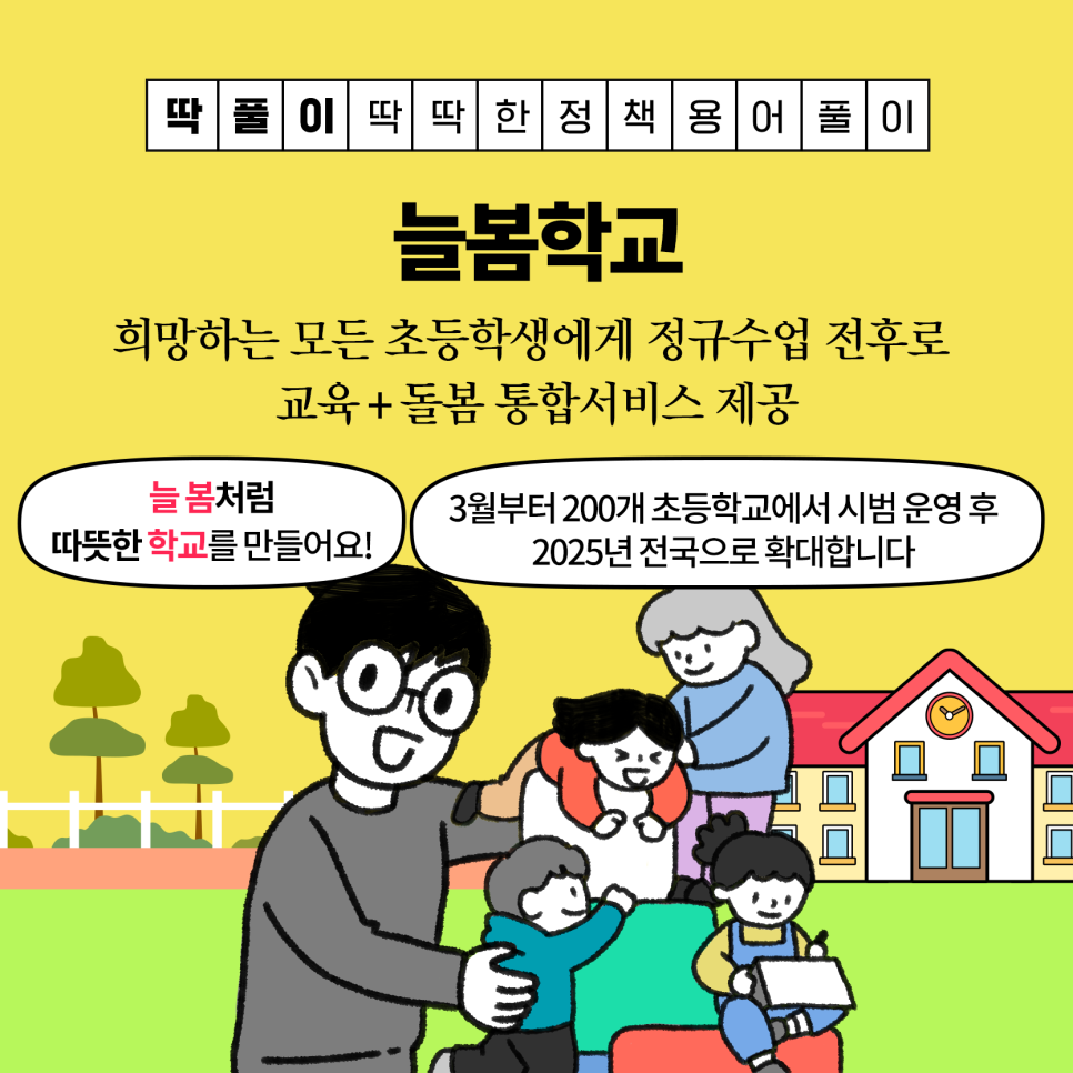 초등학생들의 교육과 돌봄 부담을 해결하기 위해, '늘봄학교'가 시범 운영되기 시작한다. '늘봄학교'는 방과 후 교육과 돌봄을 통합적으로 제공하여, 학부모의 부담을 경감하고 교육격차를 해소하기 위한 정책이다.
