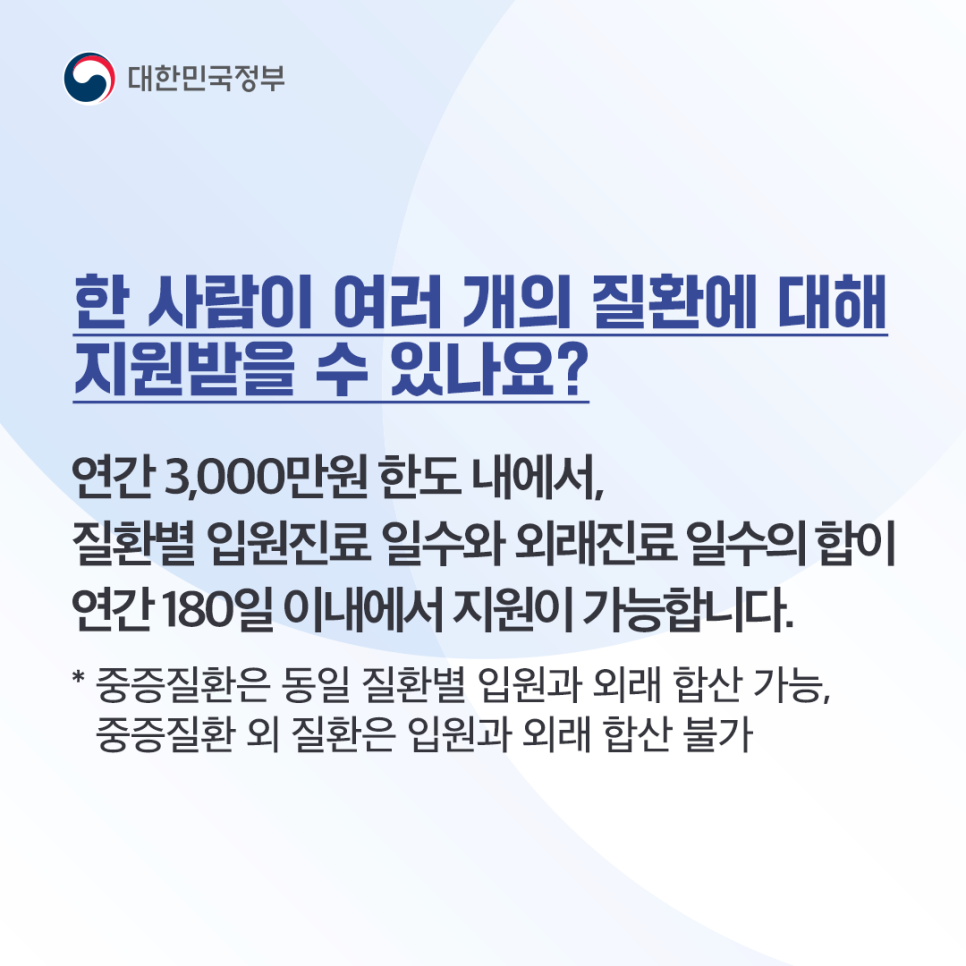 연간 3천만원 한도 내에서, 질환별 입원진료 일수와 외래진료 일수의 합이 연간 180일 이내에서 지원이 가능합니다. 중증질환은 동일 질환별 입원과 외래 합산이 가능하지만, 중증질환 외 질환은 입원과 외래 합산이 불가능합니다.