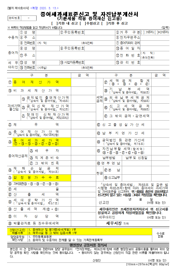 증여세 신고 시 필수 작성 자료 중 증여세과세표준신고와 자진납부계산서 서식에 대해 간략하게 소개하고, 파일도 함께 첨부하겠습니다. 아래 양식에서 노란색 부분은 증여재산가액에 대한 중요한 내용입니다.