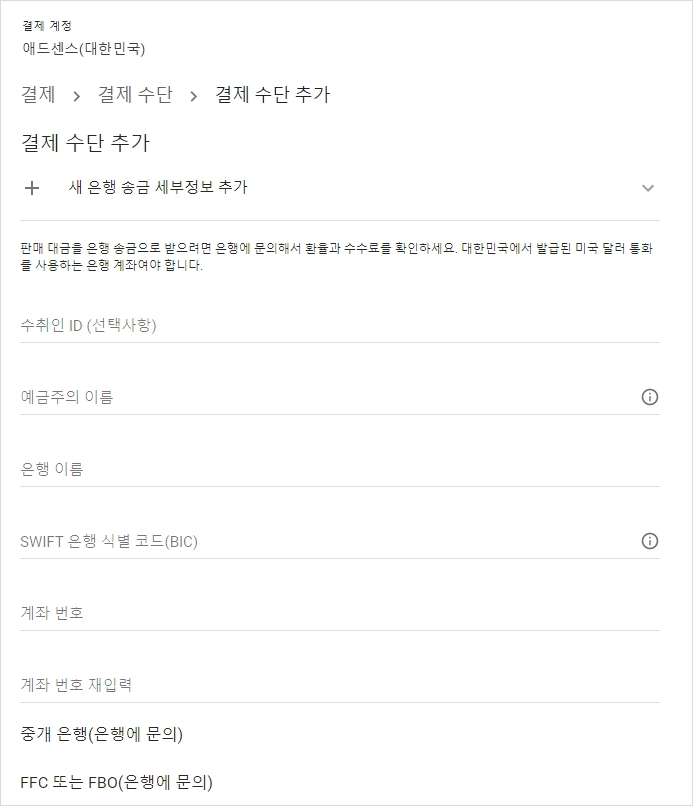 - "결제수단 추가"를 누르고 위에서 확인한 정보를 입력하여 변경해줍니다. 은행 이름(영문은행이름)과 SWIFT 은행 식별 코드는 위에서 언급된 카카오뱅크의 공지대로 입력하시면 됩니다.