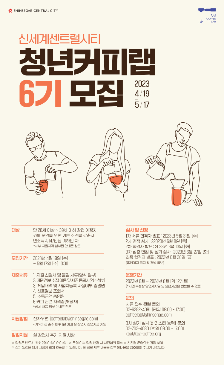 청년몽땅정보통,신세계센트럴시티 '청년커피랩' 6기 운영자 모집 공고 ▶ 청년커피랩이란? 커피 창업을 희망하는 청년들이 신세계센트럴시티, 한국커피협회, 서울먹거리창업센터, 사회연