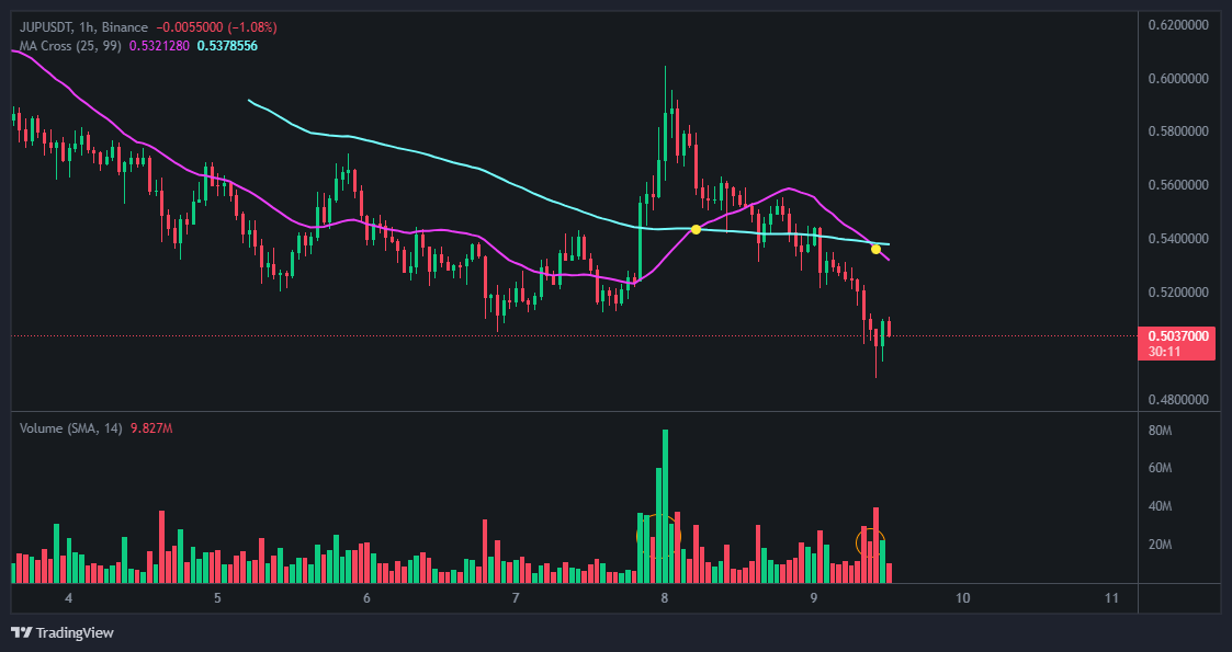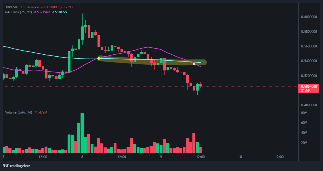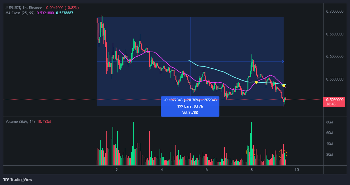 다른 종목에 비해 유독 하락수체가 강한 이 코인은 JUP 코인이다. 상장되자마자 슈팅도 못하고 그 이후로 꾸준히 하락했다가 반등을 시도했다가 다시 저항을 맞고 크게 하락했다. 고점 대비 -30% 빠졌기 때문에 여기서 되돌림이 나오기를 기대해보면 좋겠지만, 운이 나쁘다면 이대로 더 크게 하락해서 크게 손절하는 경우가 발생할 수 있다.