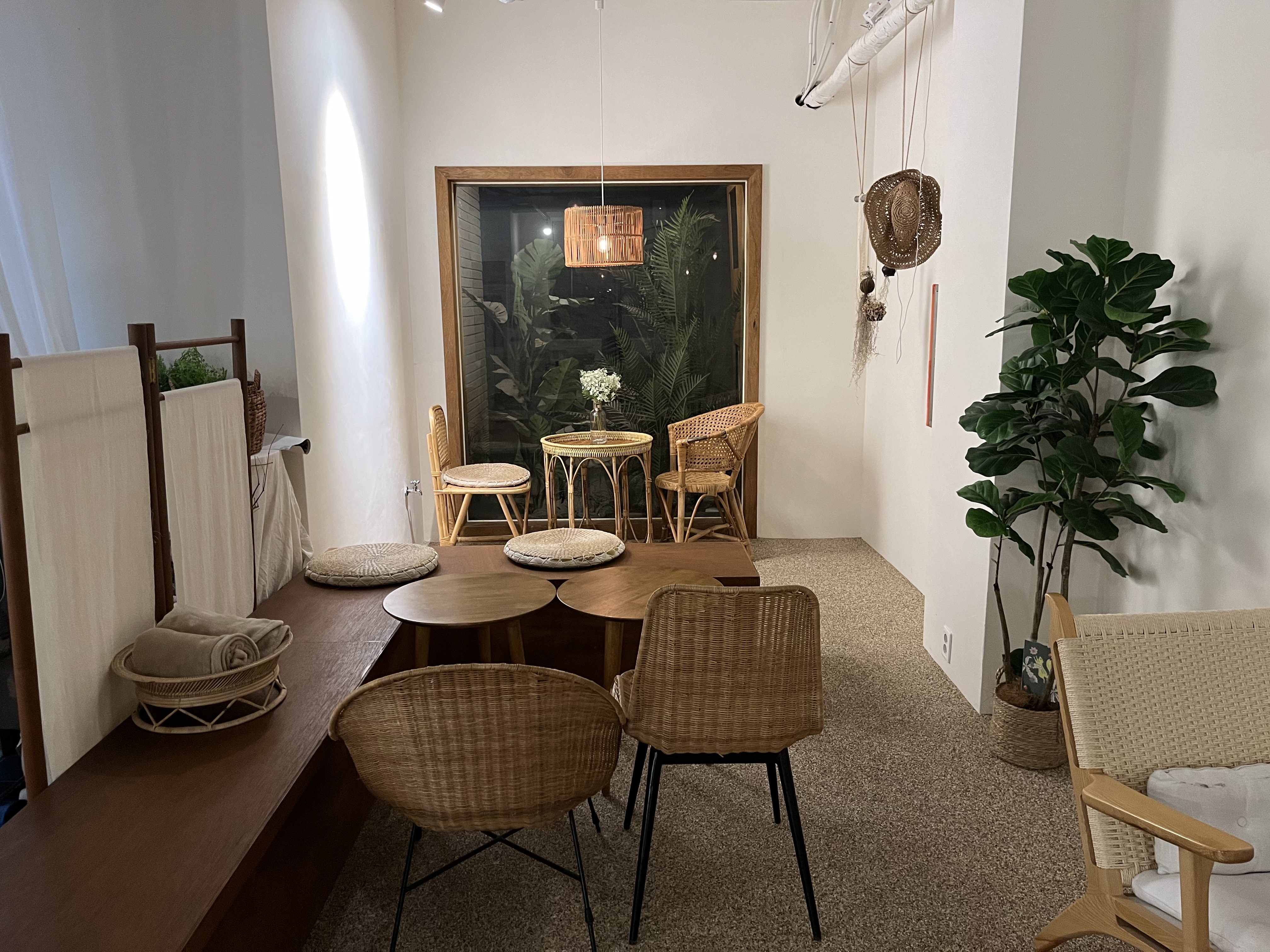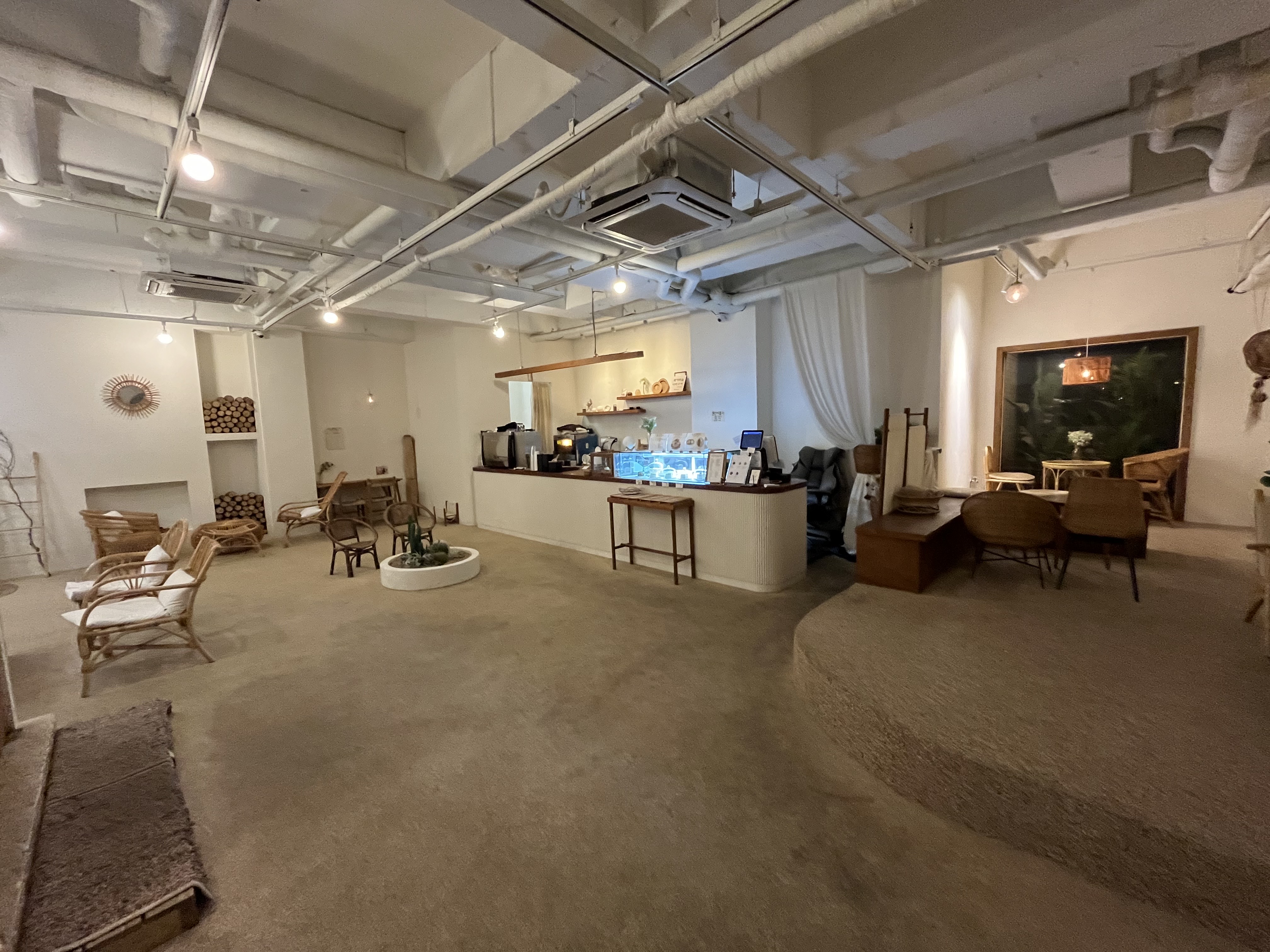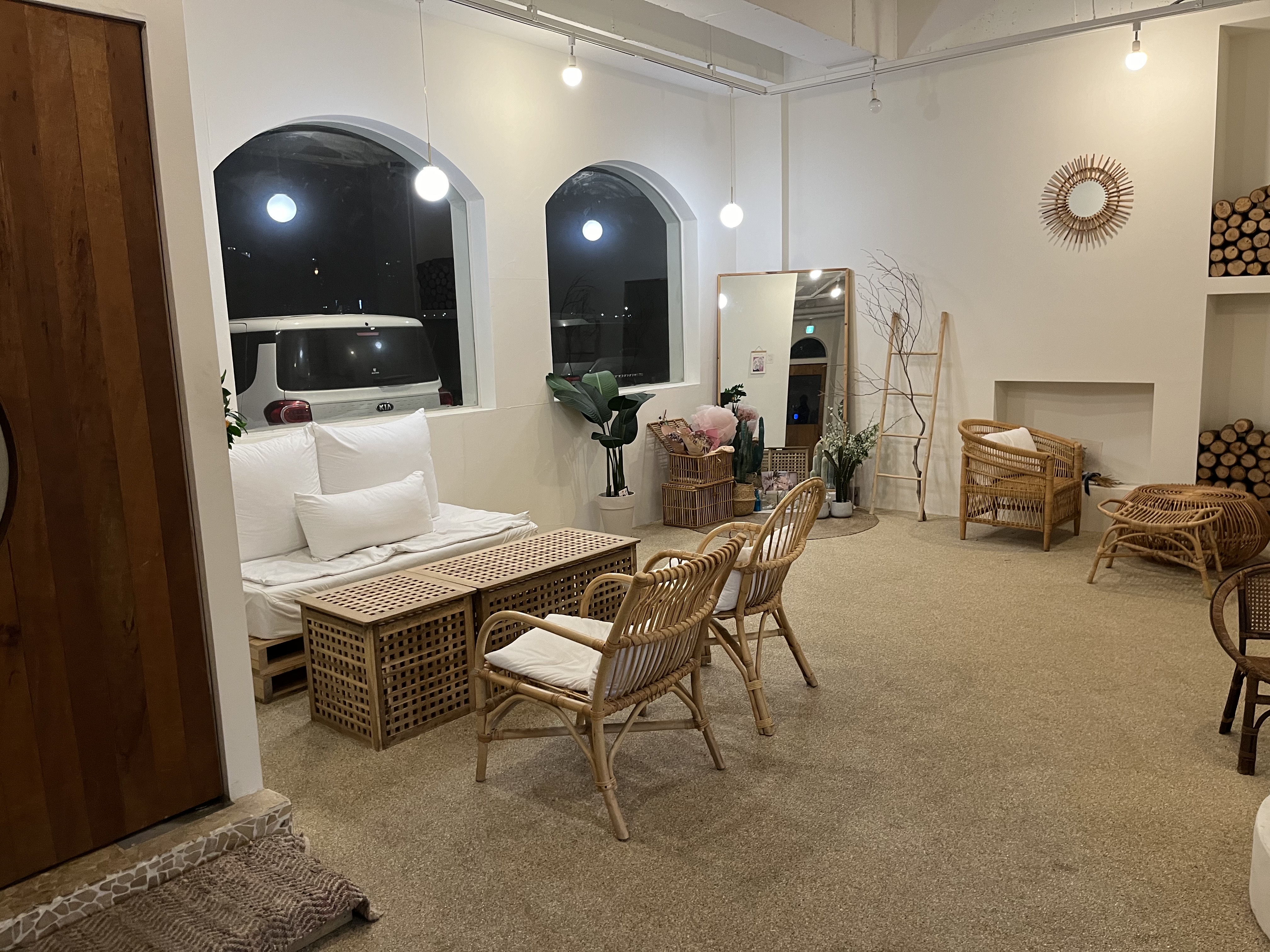 루나블루 내부는 전체적으로 라탄가구를 활용해 휴양지의 느낌을 연출합니다. 좌석 간격은 넓어 쾌적한 분위기를 조성하고 있으며, 픽업대에는 촬영으로 대관하는 모습을 볼 수 있습니다. 각 테이블마다 사진 스팟이 마련되어 있어 손님들은 이곳에서 여러 추억을 담을 수 있습니다.
