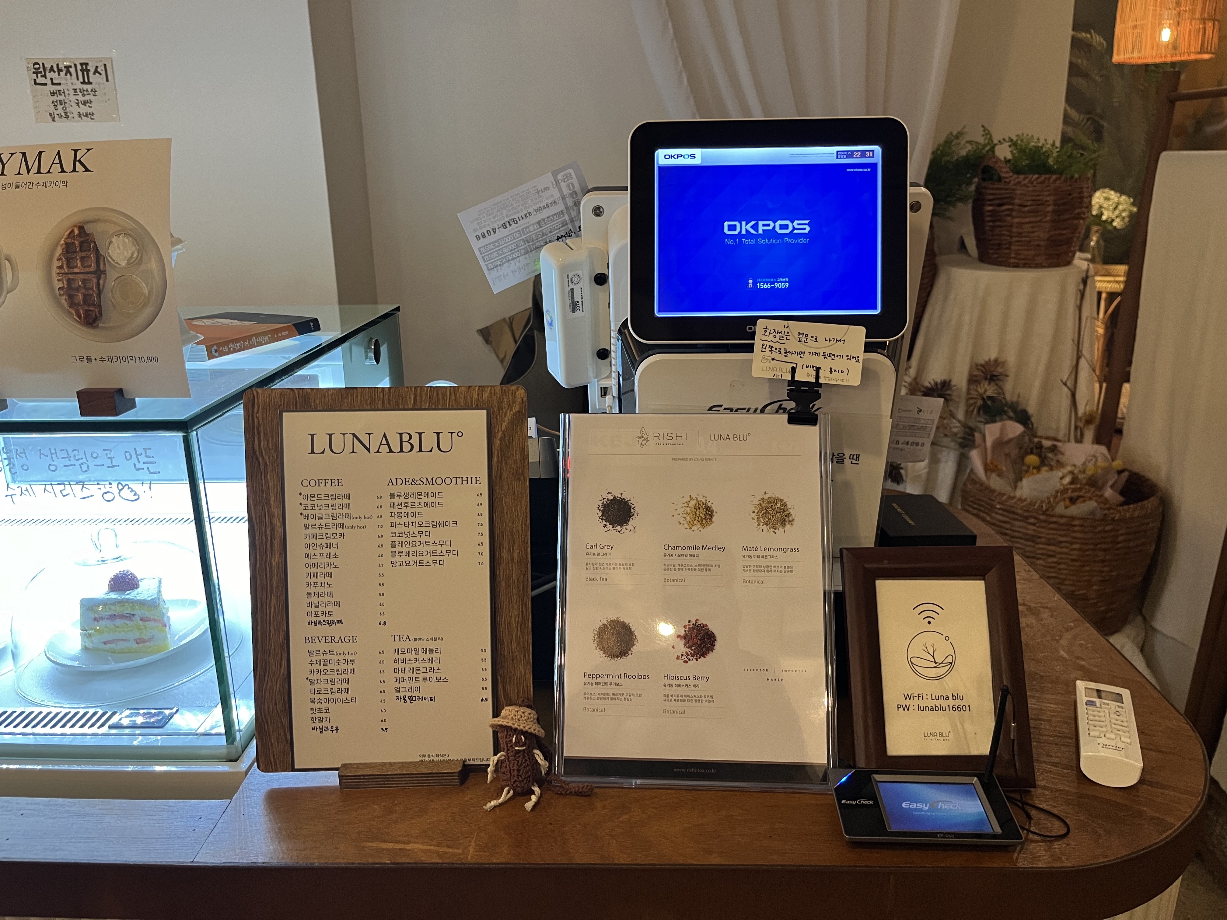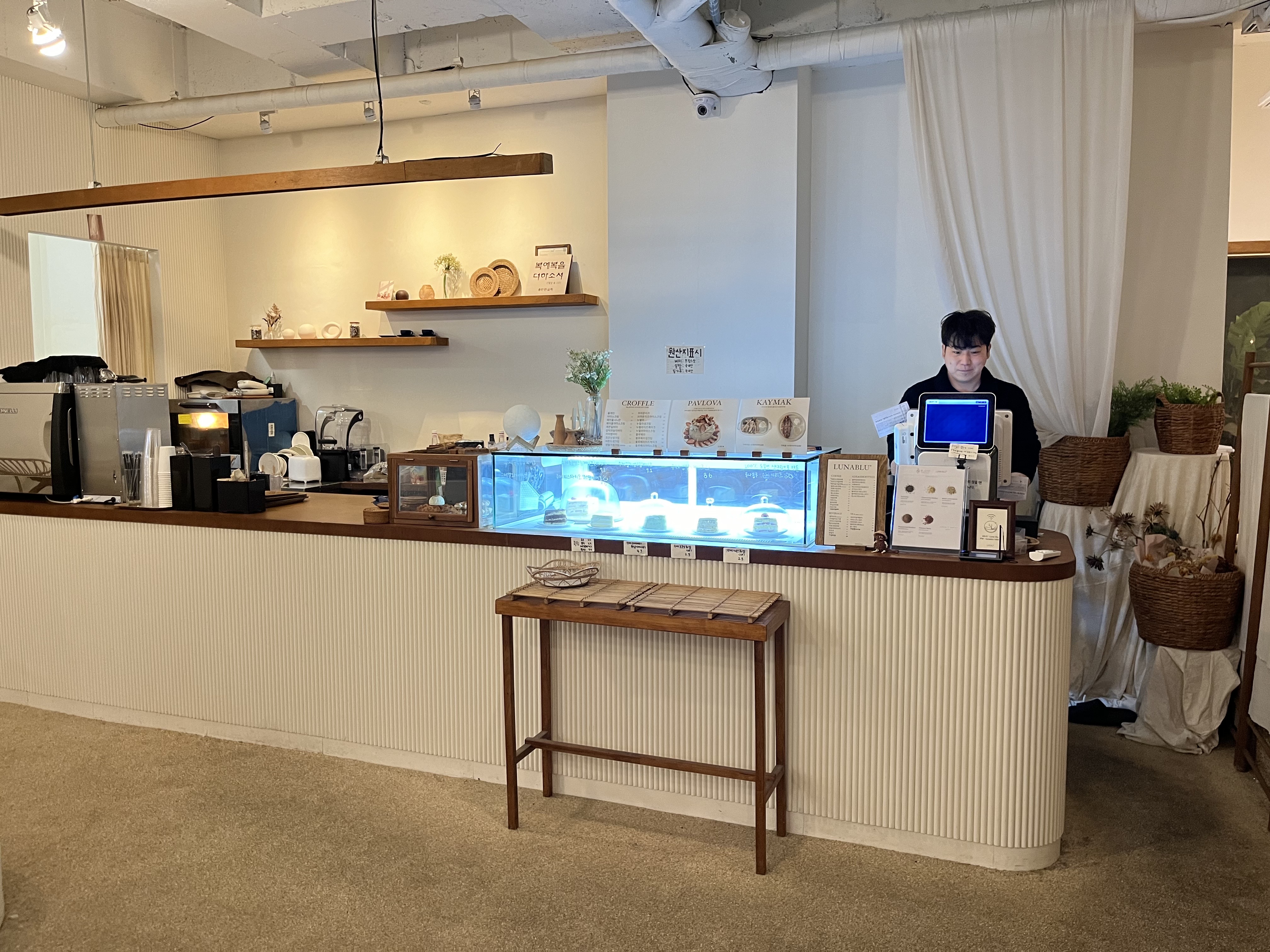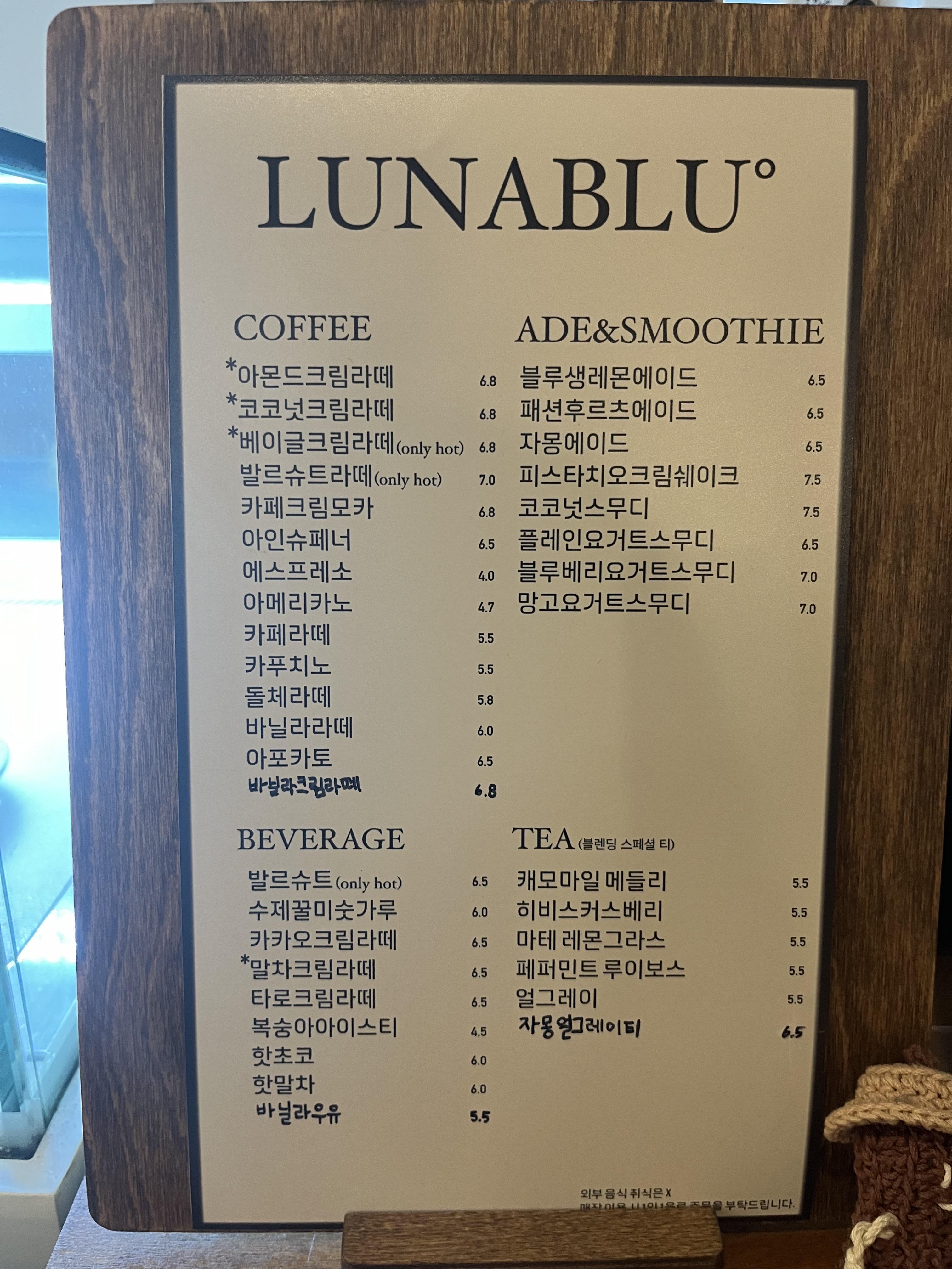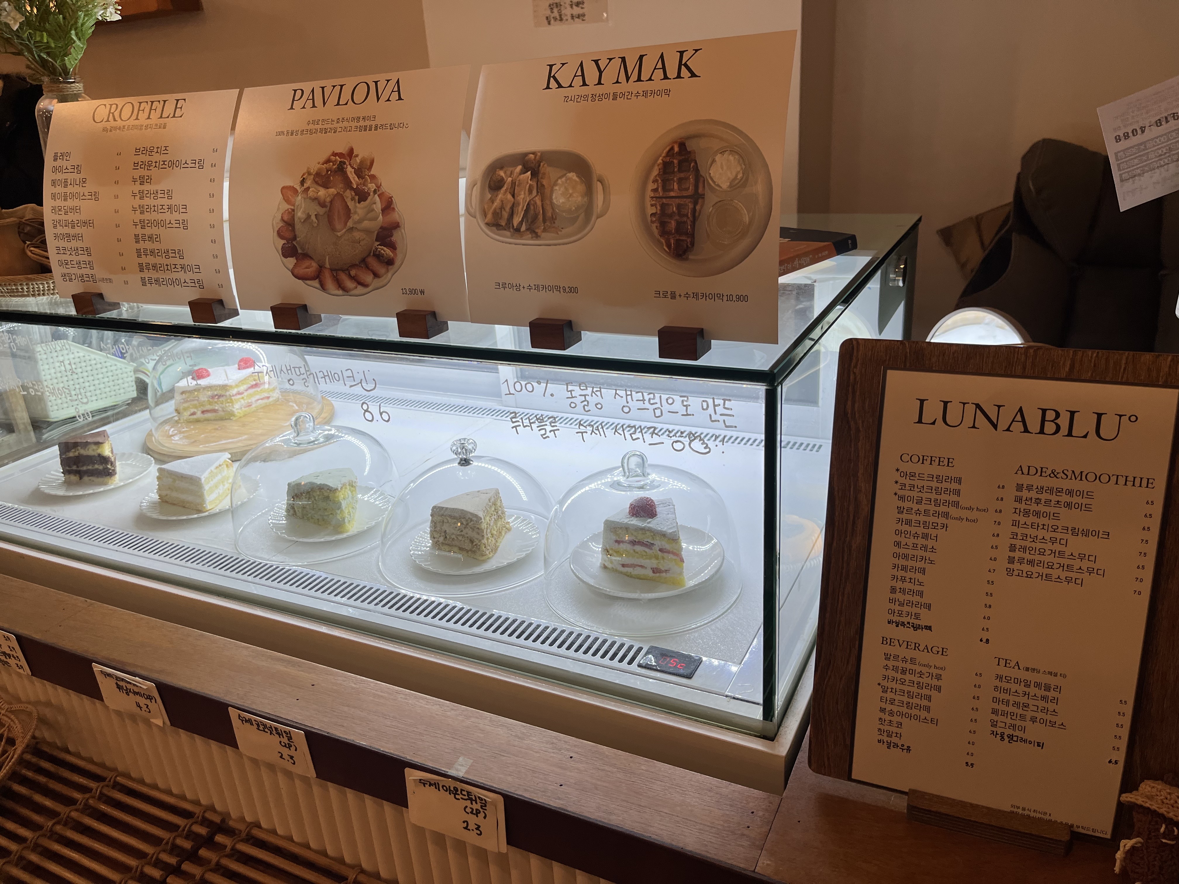 루나블루는 다양한 커피와 음료뿐만 아니라, 크로플, 카이막, 그리고 다양한 케이크 메뉴로 손님들을 맞이합니다. 메뉴는 네이버에서 확인할 수 있으나, 현장에서 메뉴가 다소 소진되어 없을 수도 있으니 사전에 확인하는 것이 좋습니다.