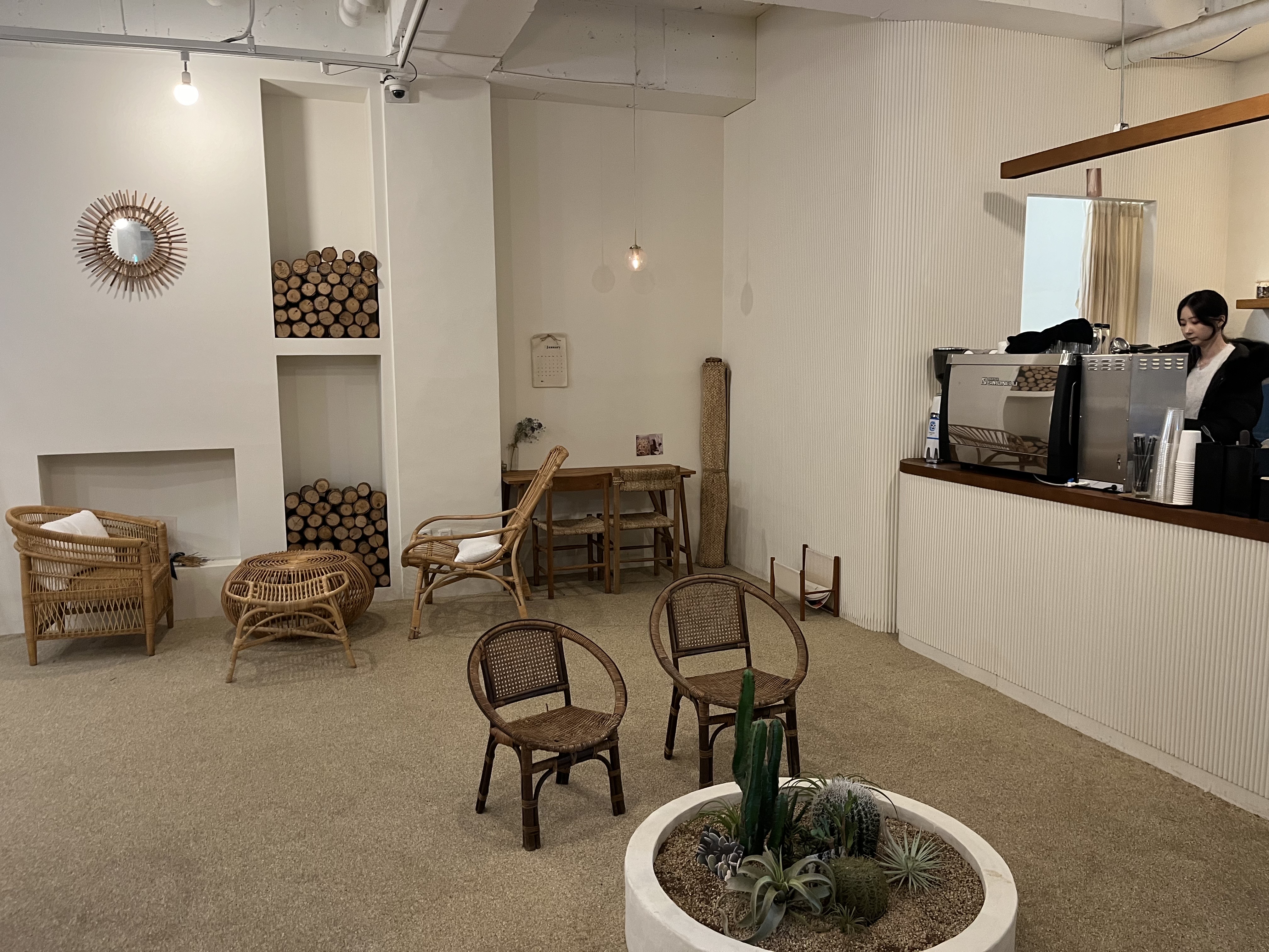루나블루 내부는 전체적으로 라탄가구를 활용해 휴양지의 느낌을 연출합니다. 좌석 간격은 넓어 쾌적한 분위기를 조성하고 있으며, 픽업대에는 촬영으로 대관하는 모습을 볼 수 있습니다. 각 테이블마다 사진 스팟이 마련되어 있어 손님들은 이곳에서 여러 추억을 담을 수 있습니다.