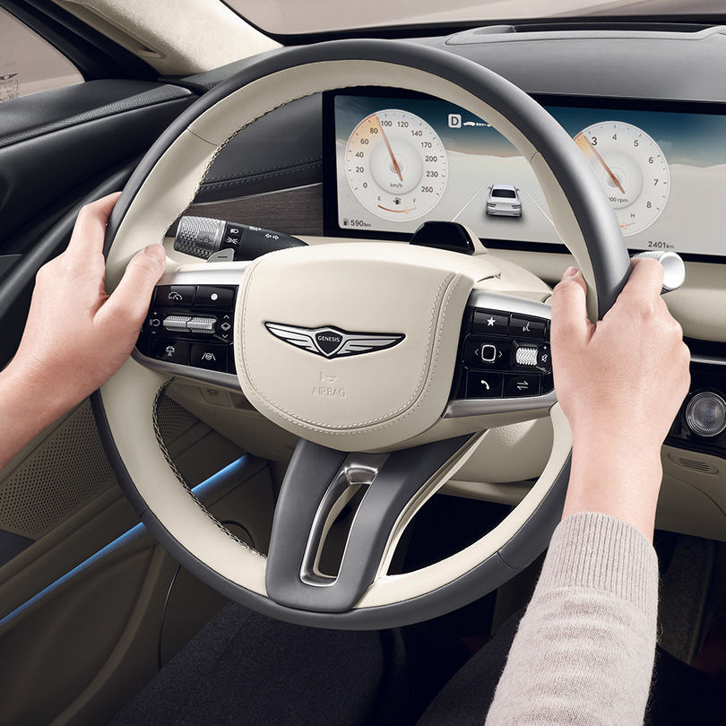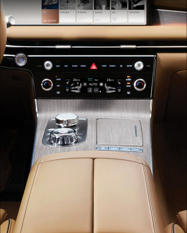 터치 타입의 에어컨 공조 조작 패널과 통합 컨트롤러는 조작이 더욱 직관적으로 쉬워졌습니다. 전자식 변속 다이얼과 신규 스티어링 휠의 도입은 디자인과 그립감을 향상시켰습니다.