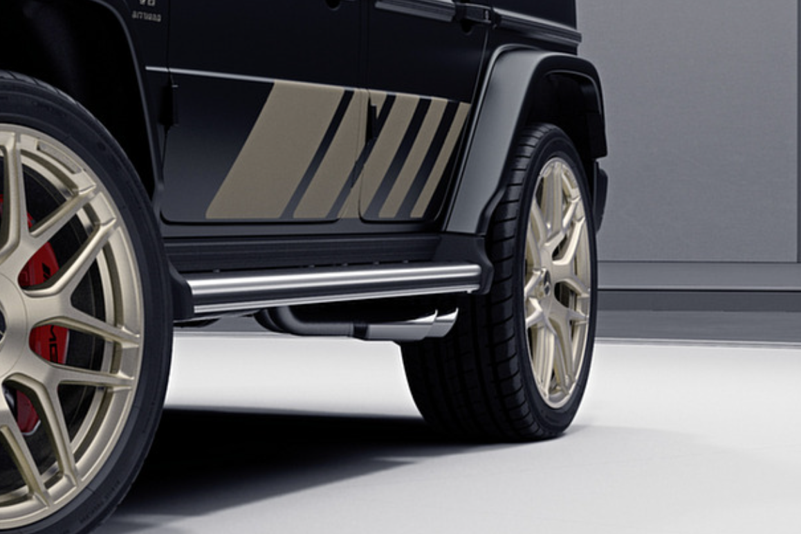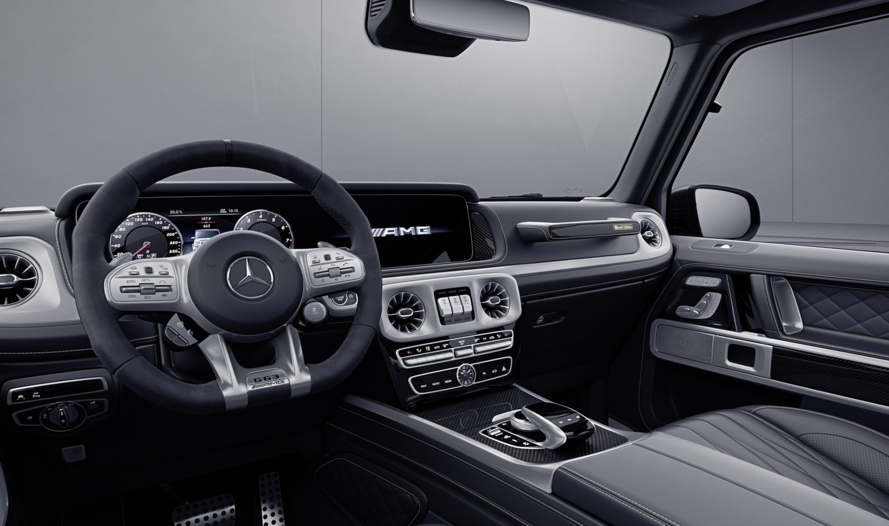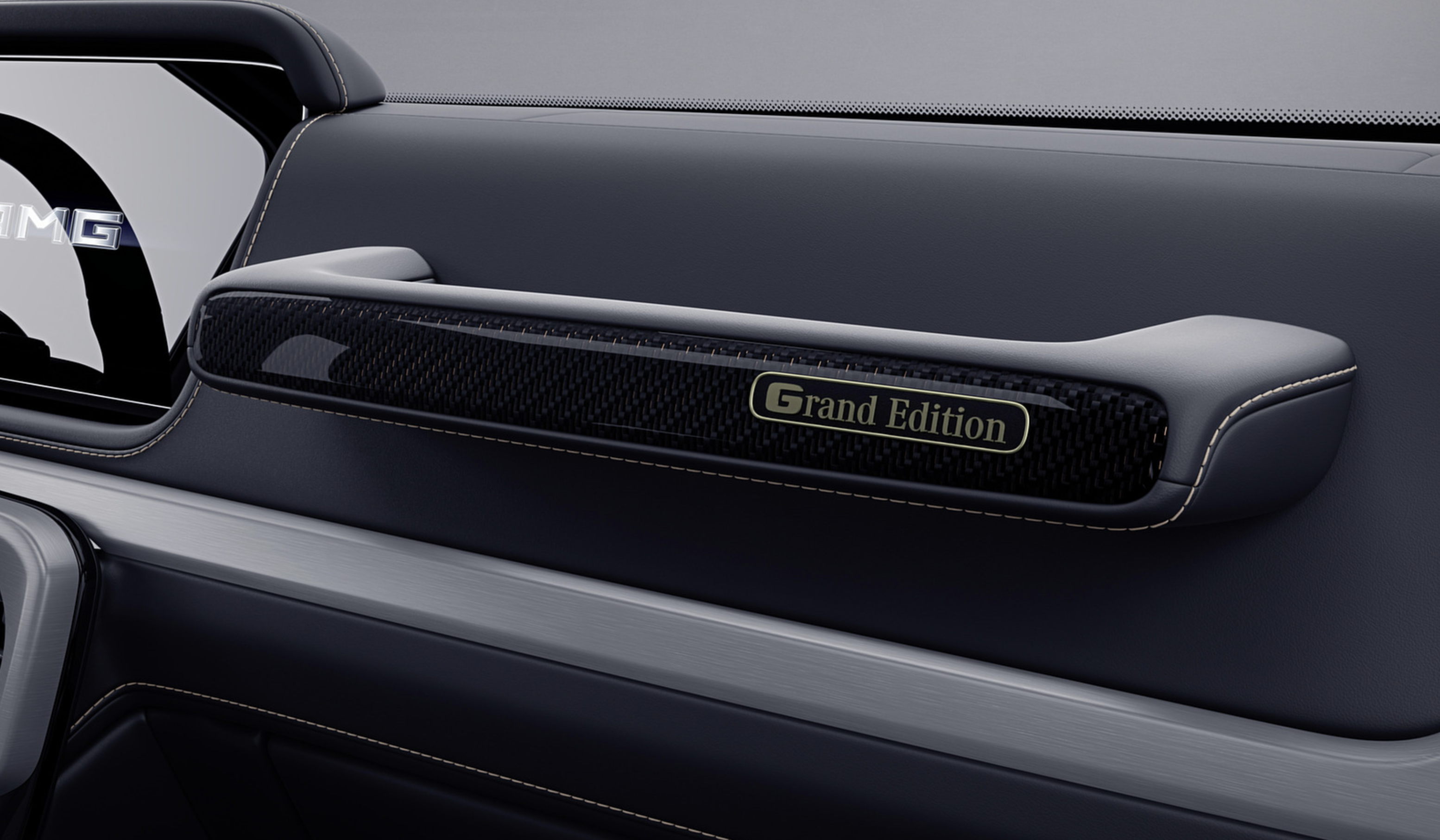 에디션의 내부는 블랙 나파 가죽 시트에 골드 스티치가 적용된 고급스러운 디자인을 선보입니다. 차량에 탑승하면 AMG 엠블럼 조명이 환영하며, 시트, 바닥 매트, 도어 손잡이는 블랙과 골드 컬러의 조합으로 돋보입니다. 조수석 대시보드 손잡이에는 'Grand Edition' 레터링과 금색 플라크가 적용되어 한정판의 특별함을 강조합니다. 또한, 루프 그립 핸들에는 나파 가죽과 카본으로 만들어진 그랜드 에디션 배지가 자리하고, AMG 퍼포먼스 스티어링 휠에는 G63 플라크가 자랑스럽게 표시됩니다.