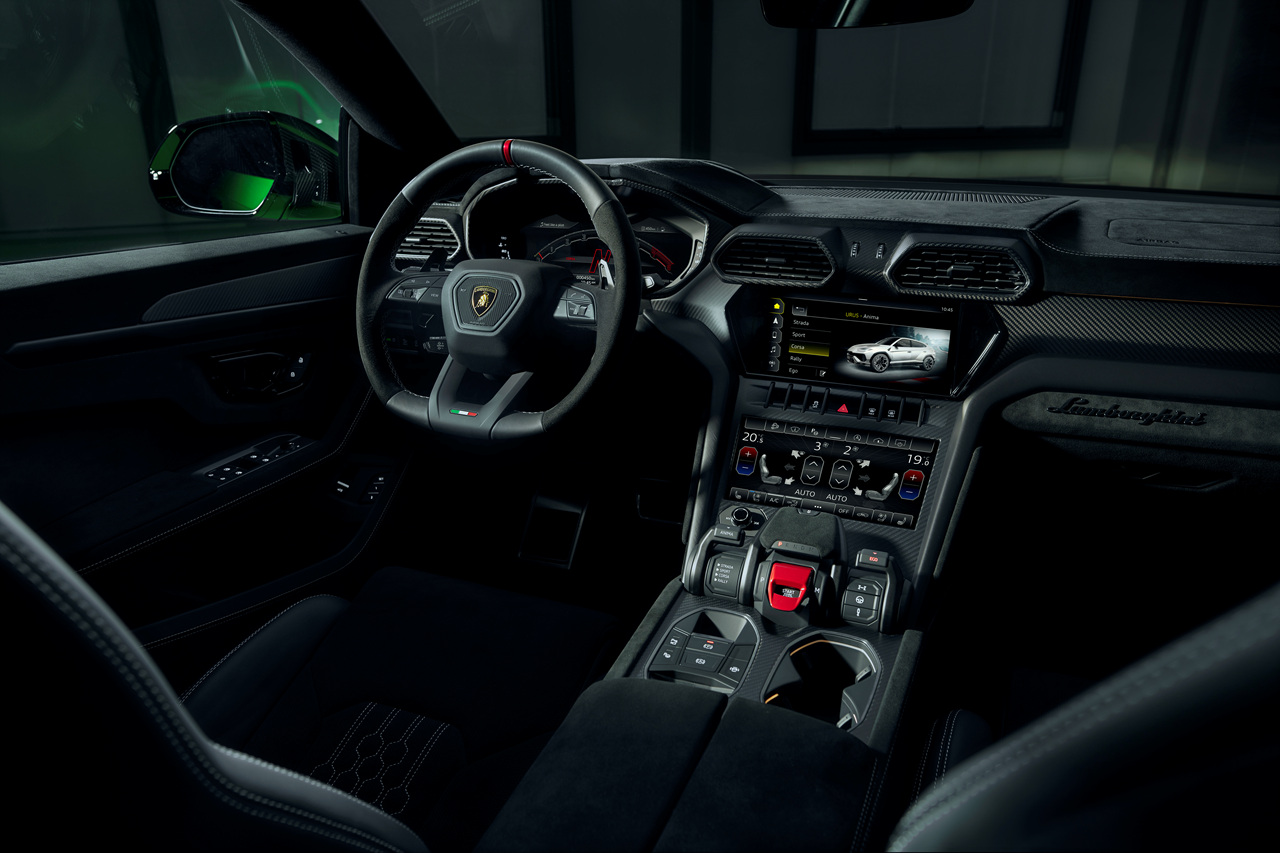 우루스 퍼포만테의 내부는 새로운 형상의 육각형 스티칭 디자인이 더해진 알칸타라 가죽시트로 기본 적용되었습니다. 센터 콘솔과 센터 디스플레이에는 HMI 그래픽이 탑재되어 람보르기니의 고급스러운 내장재를 느낄 수 있습니다.