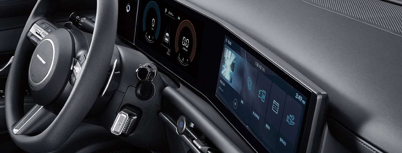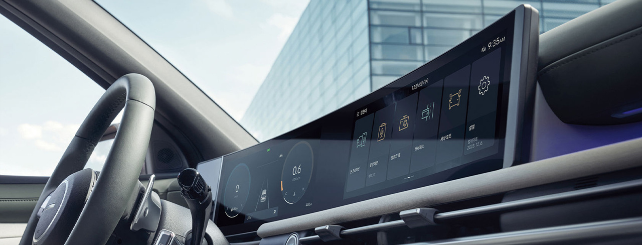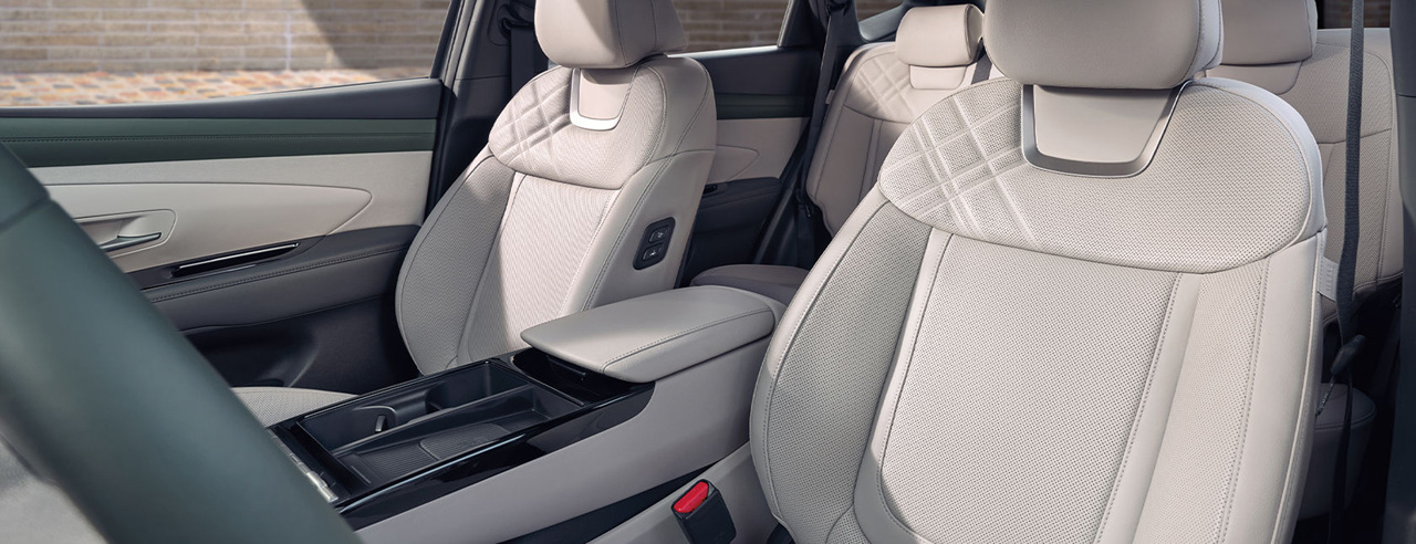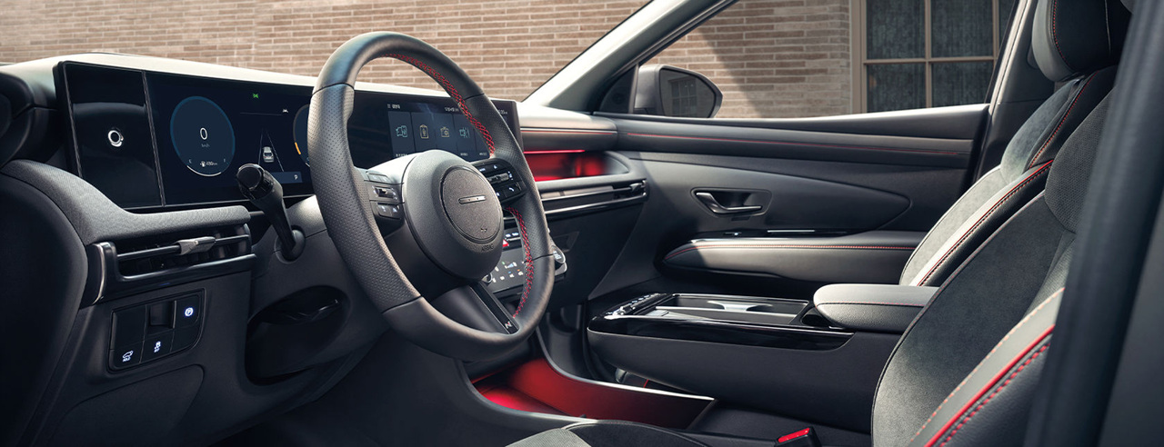 투싼 하이브리드의 내장 디자인은 와이드한 수평형 레이아웃으로 현대적이고 부드러운 공간을 제공합니다. 12.3인치 디지털 클러스터와 인포테인먼트 시스템은 고급스러운 느낌을 강조하며 정보를 선명하게 전달합니다.