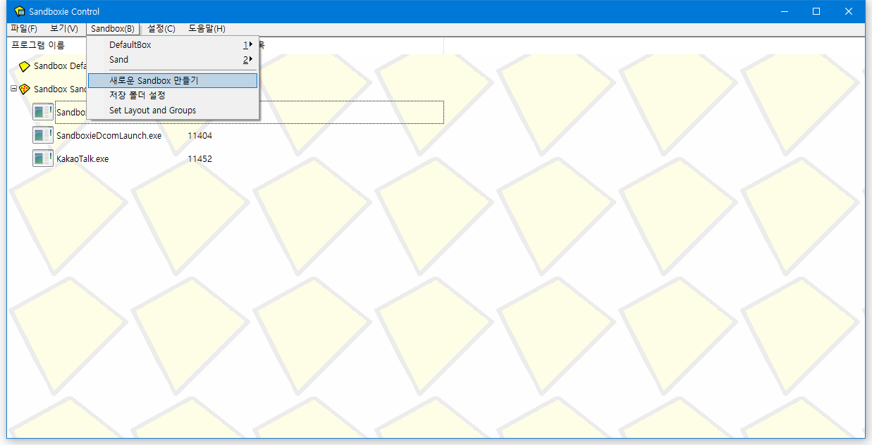 바로 샌드박스 컨트롤에서 새로운 Sandbox 만들기를 클릭해서 새로운 어드민을 형성하시면 됩니다. 기존에서 실행하는 장소에 저장된 값이 충돌을 일으키기 때문에 PC카카오톡이 문제없이 설치가 되었다면 이를 통해서 실행이 가능합니다.