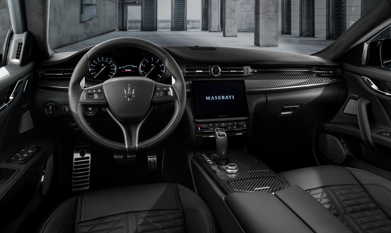 콰트로포르테의 인테리어는 최고급 가죽 소재와 세련된 우드 트리밍으로 꾸며져 있습니다. 대시보드부터 시트, 스티어링 휠까지 곳곳에서 럭셔리한 감각을 느낄 수 있습니다. 특히 10.1인치 센터 디스플레이는 최신 인포테인먼트 기술을 제공하며, 차량의 상태를 실시간으로 확인할 수 있습니다. 또한 아날로그 시계는 고전적인 멋을 더해줍니다.